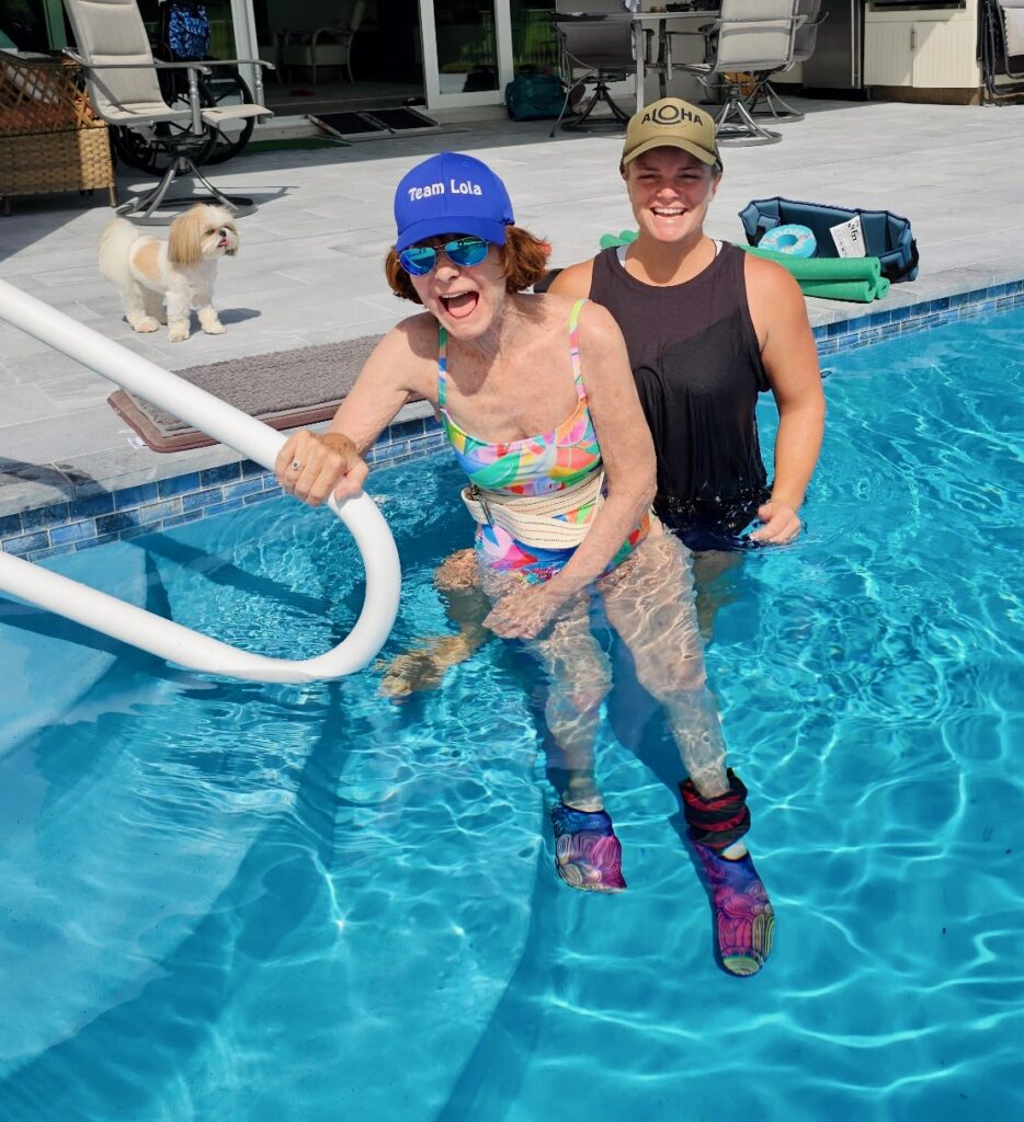 In March of 2025, Lola suffered a stroke while doing yoga in her home. Her stroke affected her left side strength, sensation and coordination. She had difficulty sitting upright, maintaining attention, visually scanning across a room and coordinating functional movements. I feel incredibly lucky to have met Lola on her first morning in rehab. Her humor, motivation, love and compassion was evident in each session she shared with me and the other therapists. Her passion for the water and movement was clear. She and her husband, Rico, shared stories about their times in the Keys, diving, running (and winning races), planting coral and simply enjoying life in the water. Rico and I had a conversation at the rehab, soon before discharge. He told me how he and Lola would love to have her participate in aquatic therapy in the future. I was eager to share that I was recently aquatic therapy certified and that Lola should keep in touch, who knows what the future could hold! Lola continued to work tirelessly in rehab in order to return home.